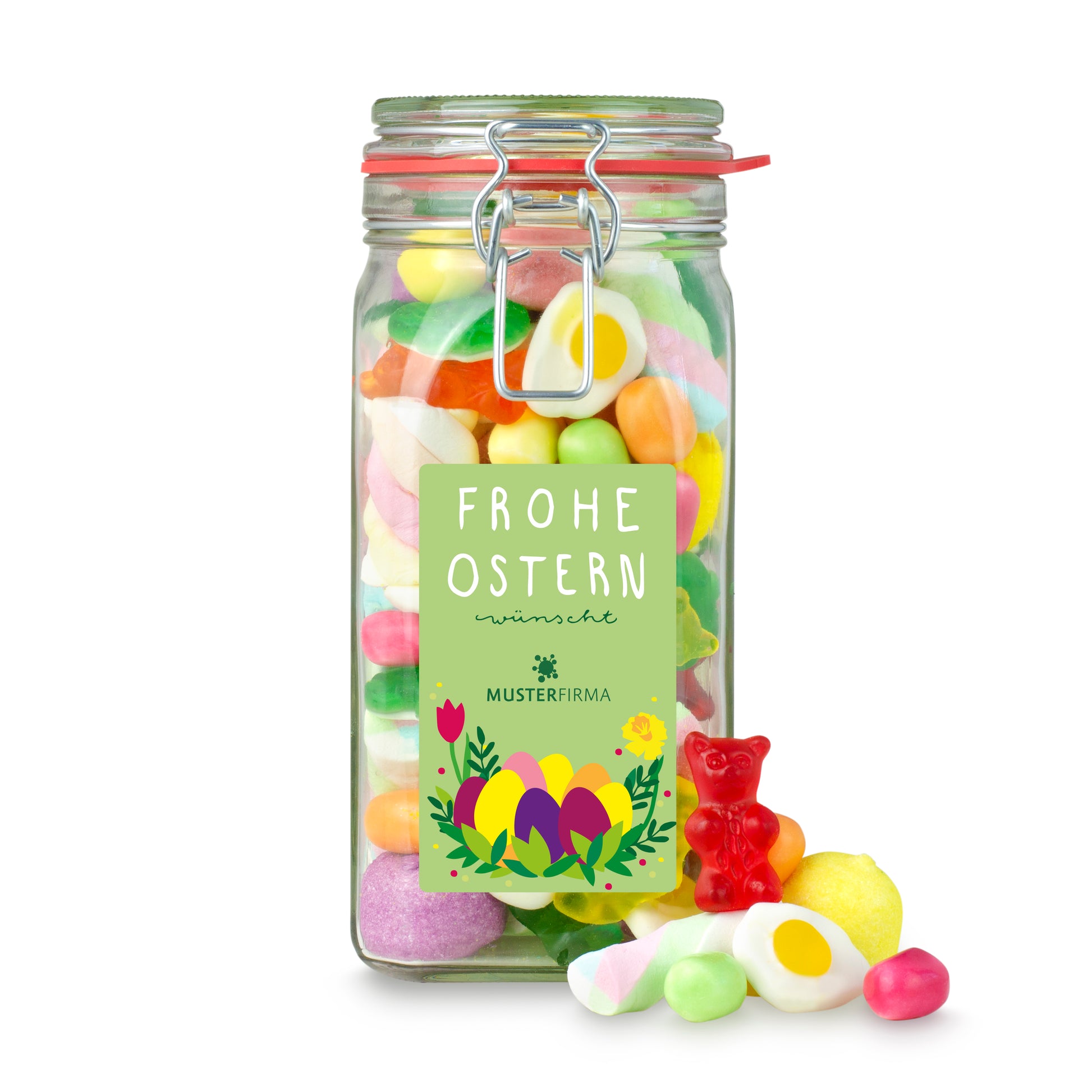 Das große Glas voll Osterfreude.Hochwertiges, vielfältig wiederverwendbares Einmachglas, gefüllt mit einer bunten Oster-Süßigkeiten-Mischung.