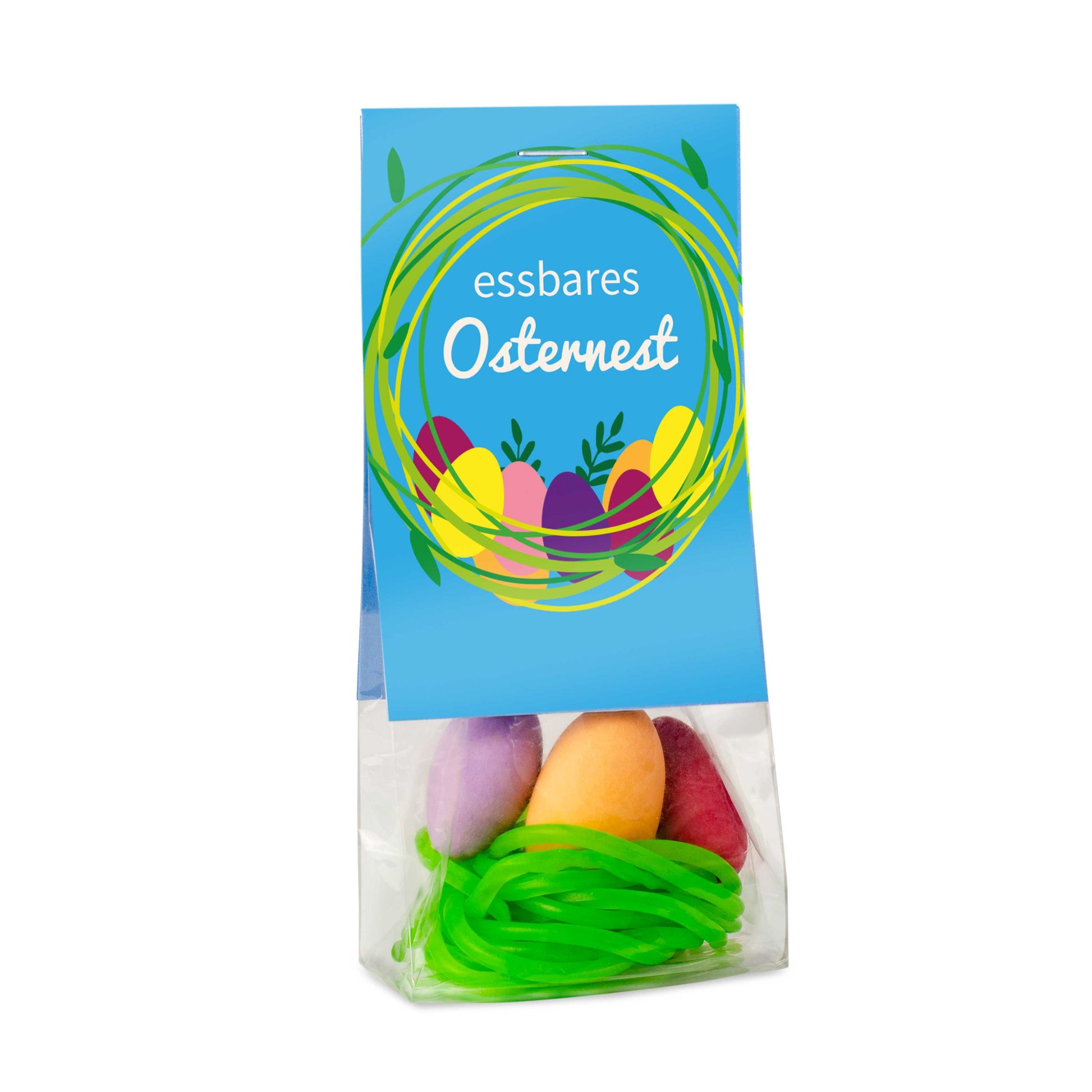 Los geht der Osterspaß!Das essbare Osternest: süße Mandel-Eier im Fruchtgummi-Nest lassen Naschkatzenherzen höher schlagen.