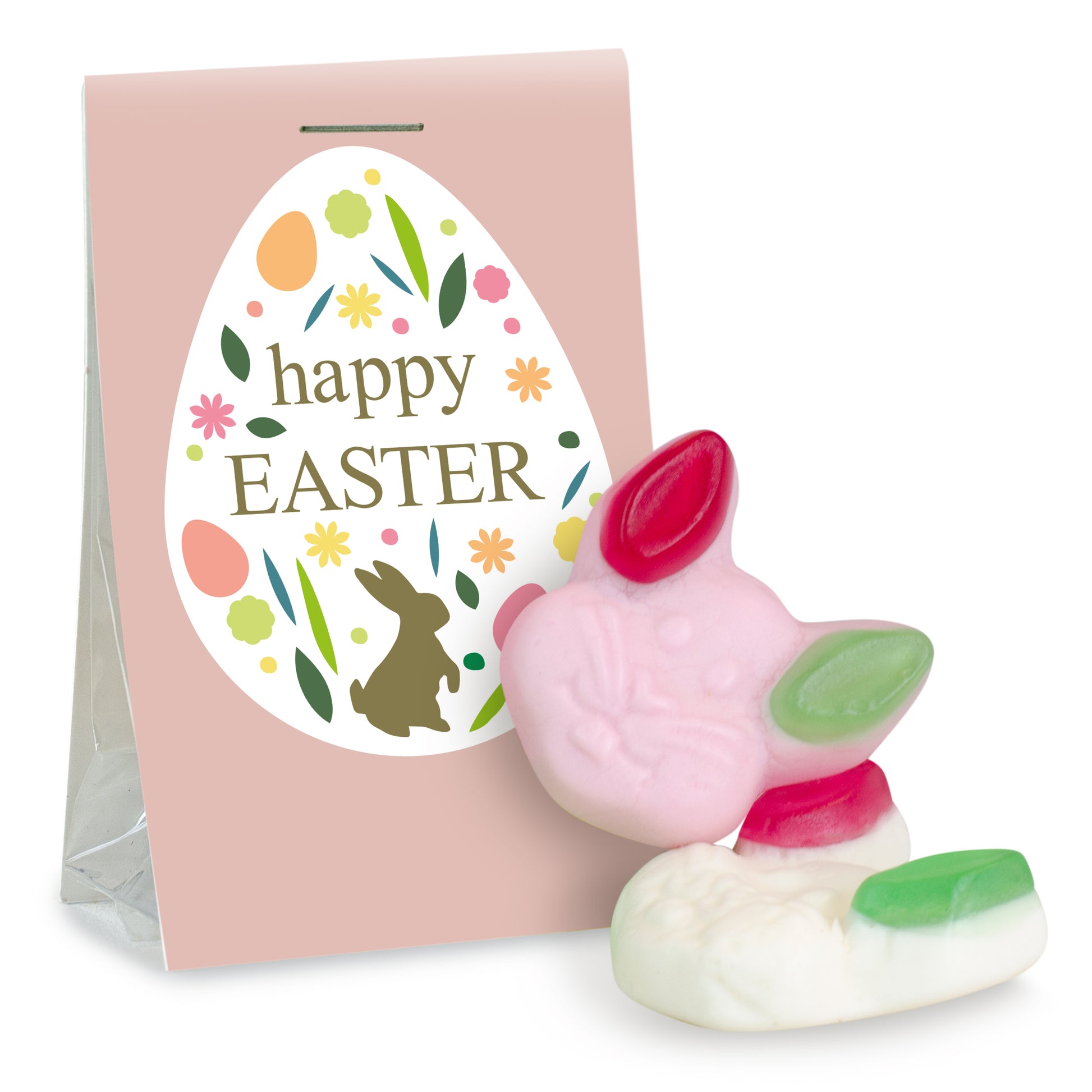 Vegane Osterhasen im Taschenformat.Klein, aber genussvoll! Perfekt als Streuartikel für die Osterzeit mit großer Druckfläche für Ihre individuelle Botschaft.
